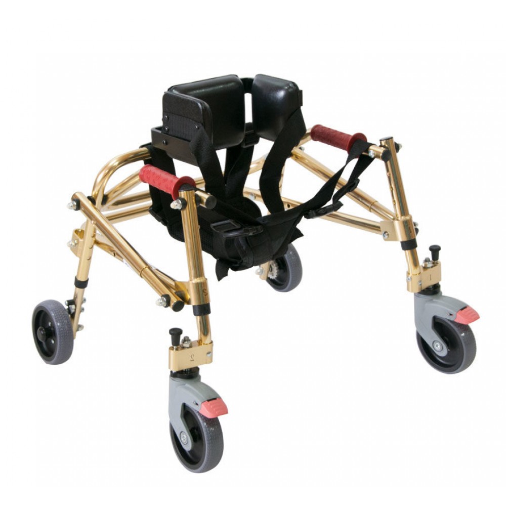 Ходунки на четырех колесах реверсивного типа предназначены для детей-инвалидов, страдающих различными формами ДЦП, способствуют устранению нарушений осанки и патологической установки стоп, помогают удерживать равновесие при ходьбе и стоянии.